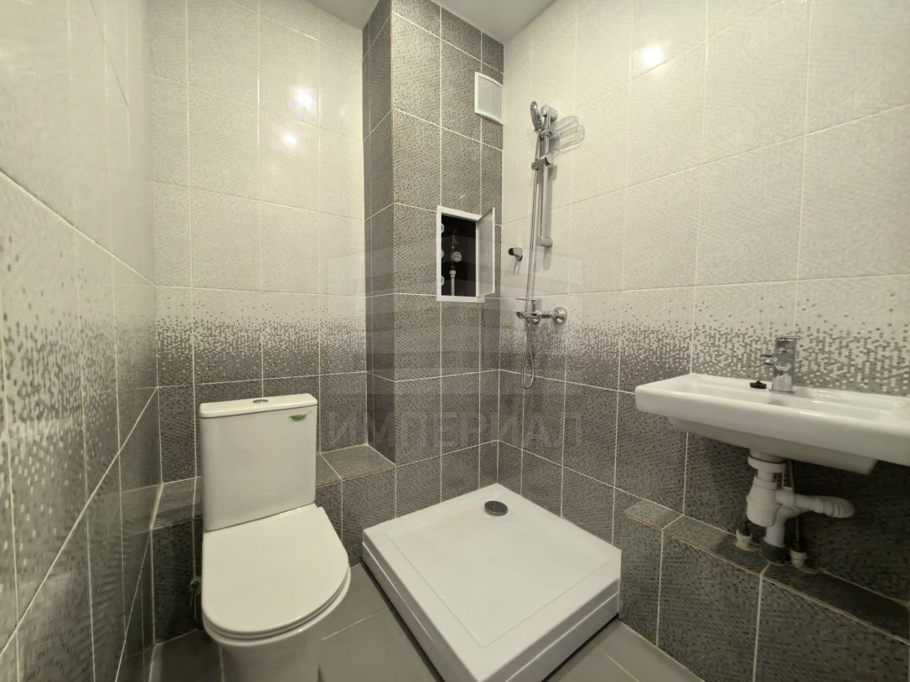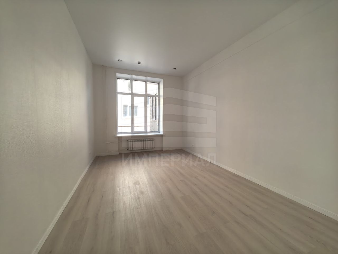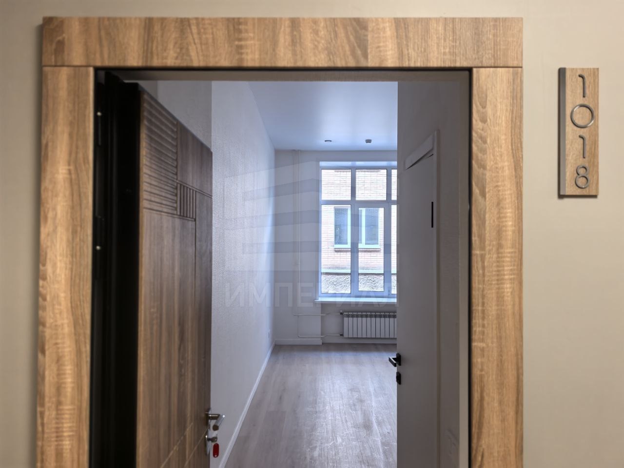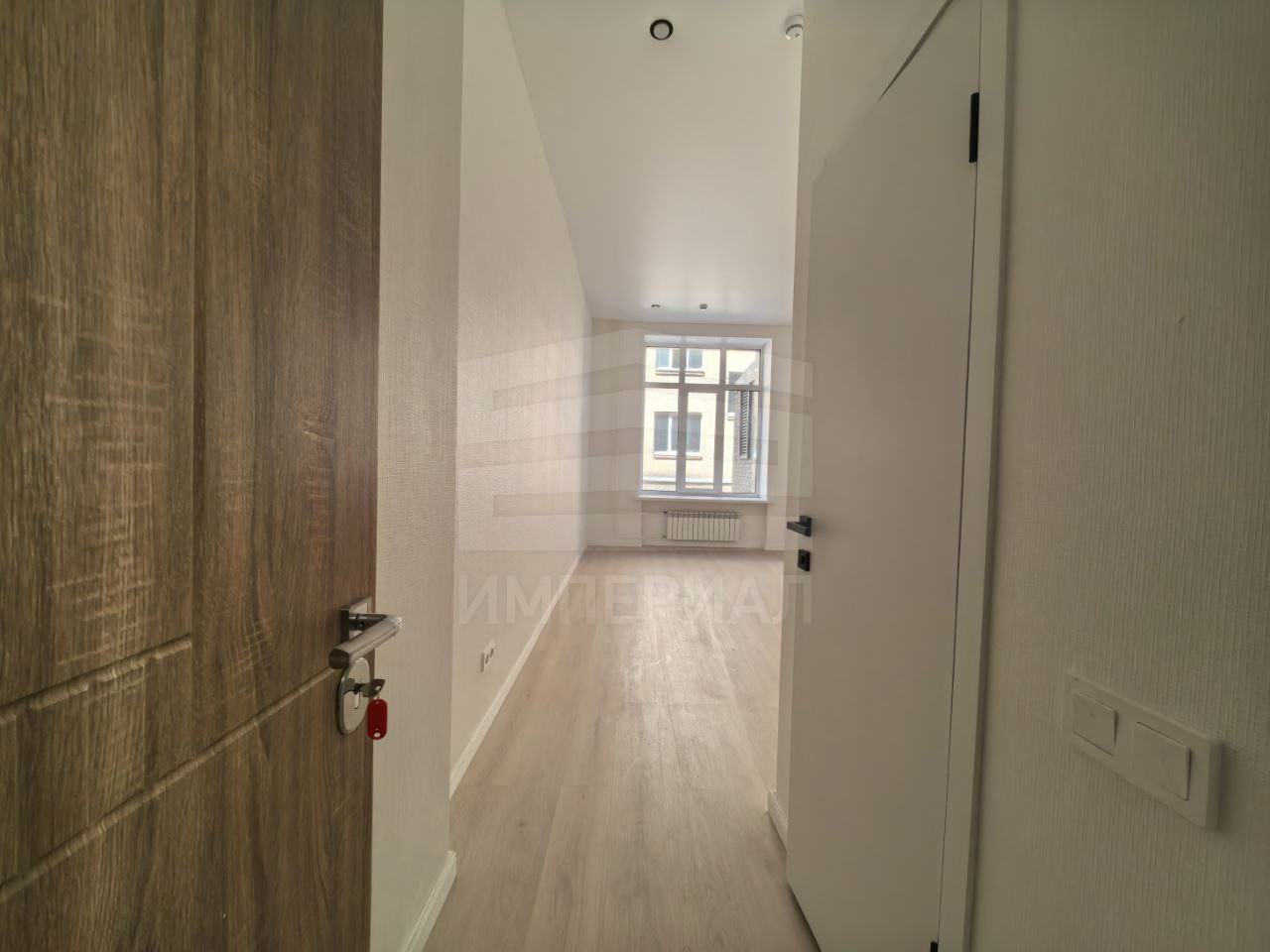 На стенах поклеены обои под покраску, на полу постелен ламинат с плинтусами и откосами. Есть вытяжная вентиляция в санузле и на кухне, выходы хв/гв, место под раковину на кухне. Кроме того, в помещениях уже есть выключатели освещения, розетки для бытовой техники и роутера, а также сделаны закладные для оптоволокна для интернета.
