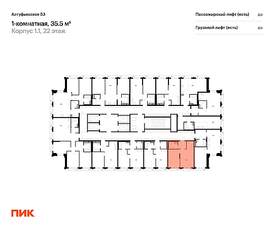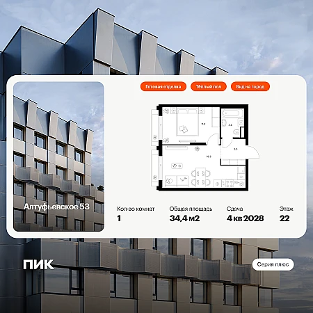 Продаётся 1-комн.квартира площадью 34.40 кв.м на 22 этаже 32 этажного дома (Корпус 1.1, секция 4) проекта ПИК Алтуфьевское 53. Светлый просторный подъезд на уровне земли, функциональная планировка, большие окна, с отделкой.