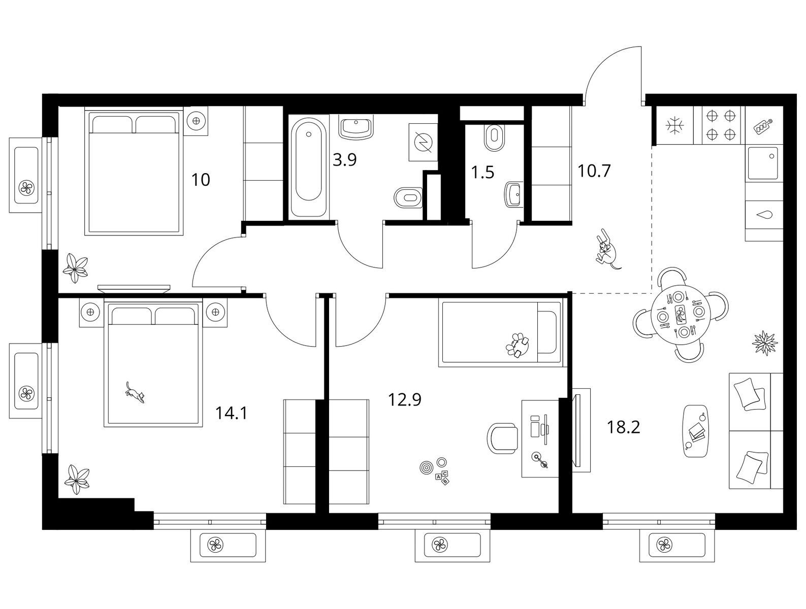 В проекте вы найдёте планировки для разных сценариев жизни: есть квартиры с мастер-спальнями и комнатами, разнесёнными по разным сторонам квартиры. Большие семьи оценят удобные планировки с постирочными и гардеробными. А для тех, кто ценит простор, мы подготовили квартиры с террасами, балконами и лоджиями. Артикул - 1004521