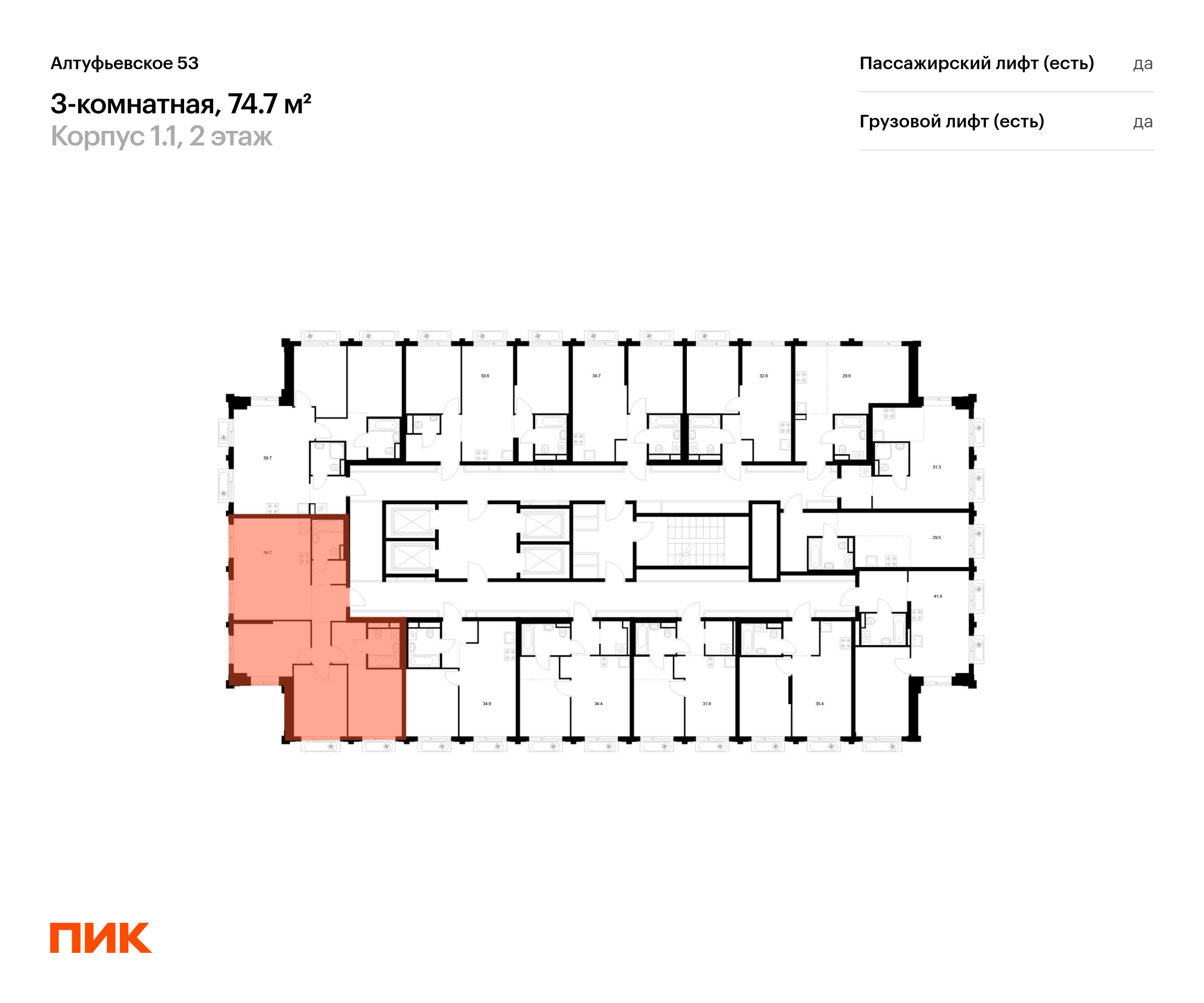 Продаётся 3-комн.квартира площадью 74.60 кв.м на 2 этаже 32 этажного дома (Корпус 1.1, секция 4) проекта ПИК Алтуфьевское 53. Светлый просторный подъезд на уровне земли, функциональная планировка, большие окна, с отделкой.