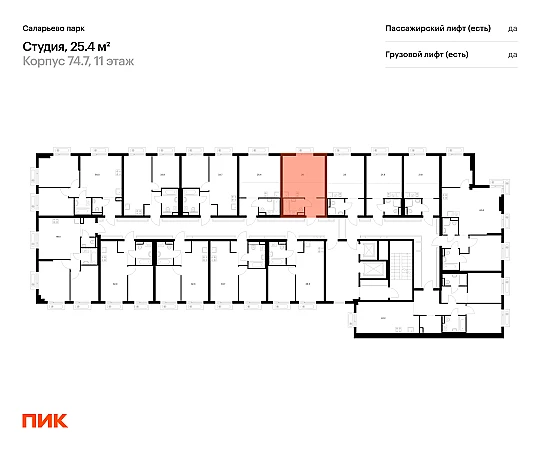 Продаётся квартира-студия площадью 25.40 кв.м на 11 этаже 16 этажного дома (Корпус 74.7, секция 7) проекта ПИК Саларьево парк. Светлый просторный подъезд на уровне земли, функциональная планировка, большие окна, с отделкой.