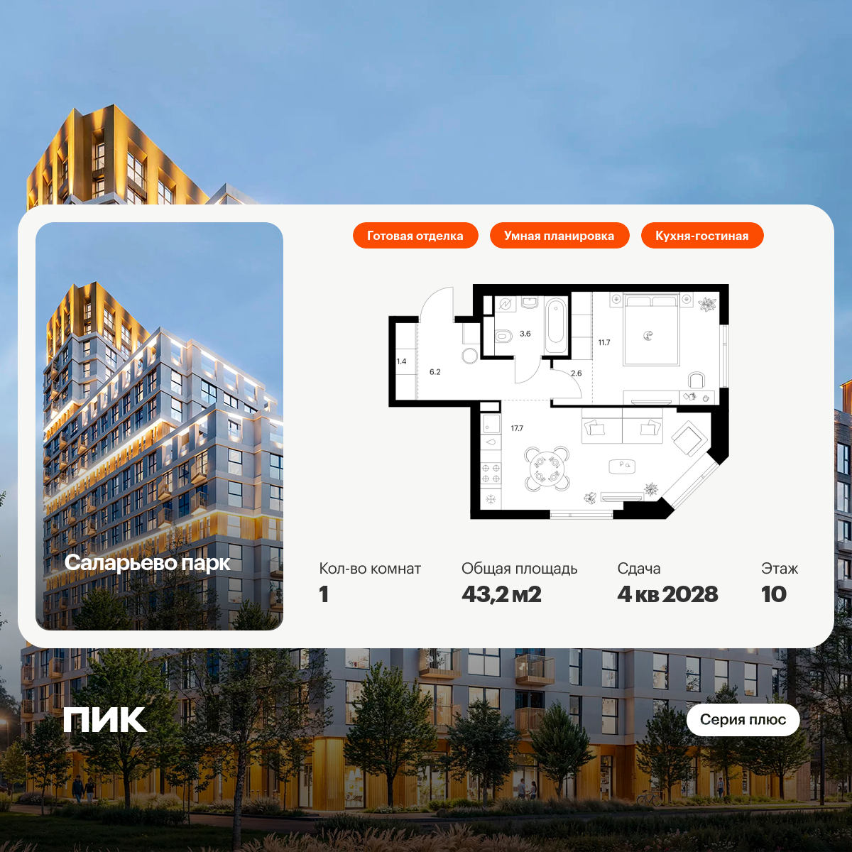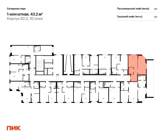 Продаётся 1-комн.квартира площадью 43.20 кв.м на 10 этаже 16 этажного дома (Корпус 82.2, секция 2) проекта ПИК Саларьево парк. Светлый просторный подъезд на уровне земли, функциональная планировка, большие окна, с отделкой.