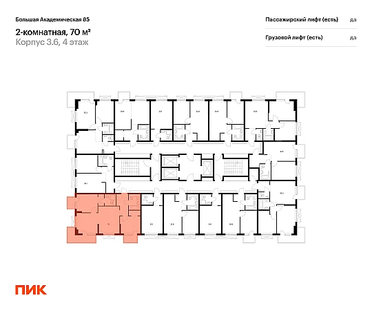 Продаётся 2-комн.апартамент площадью 70.00 кв.м на 5 этаже 24 этажного дома (Корпус 3.6, секция 2) проекта ПИК Большая Академическая 85. Светлый просторный подъезд на уровне земли, функциональная планировка, большие окна, с отделкой.