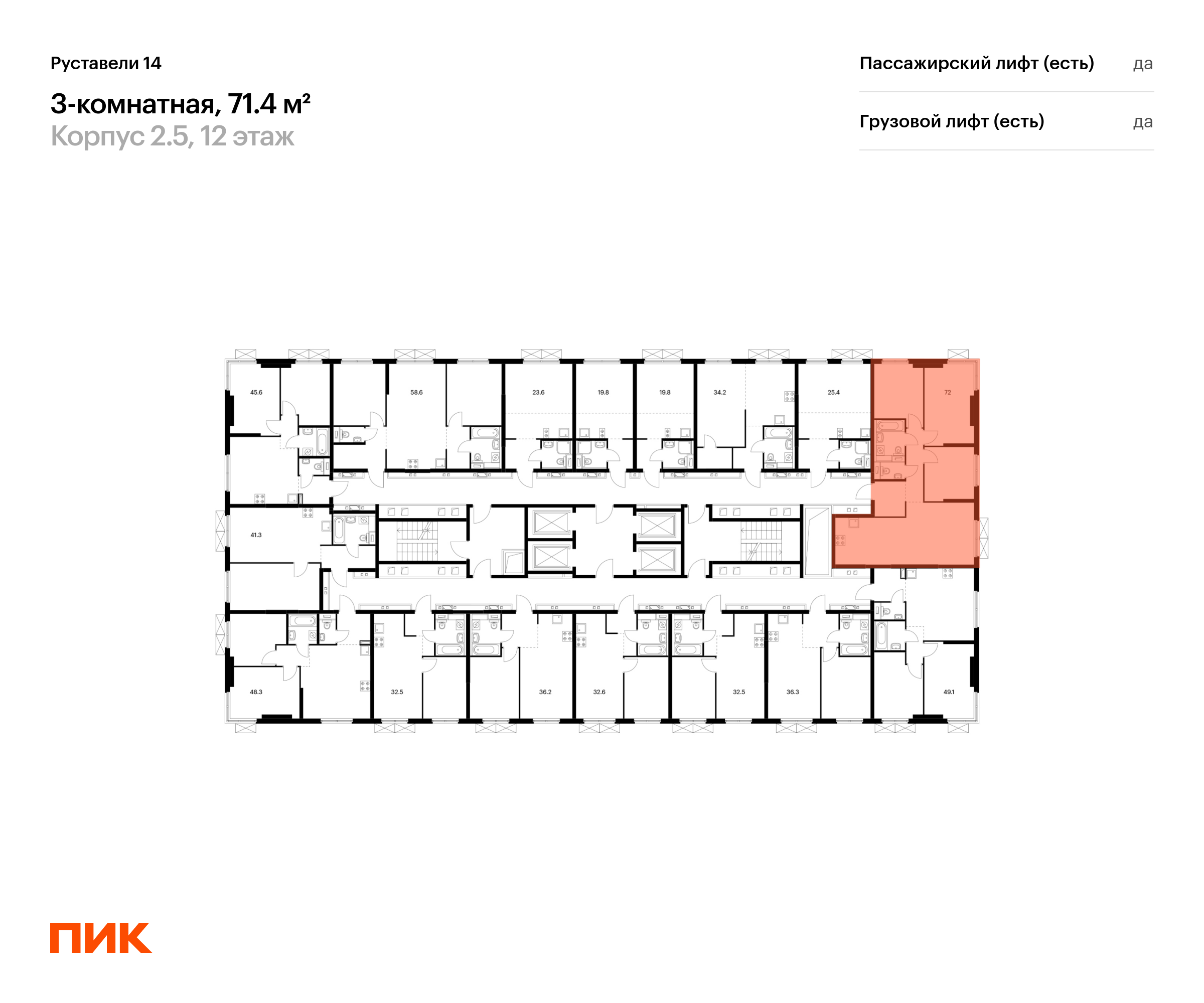Продаётся 3-комн.квартира площадью 71.40 кв.м на 12 этаже 33 этажного дома (Корпус 2.5, секция 1) проекта ПИК Руставели 14. Светлый просторный подъезд на уровне земли, функциональная планировка, большие окна, с отделкой.