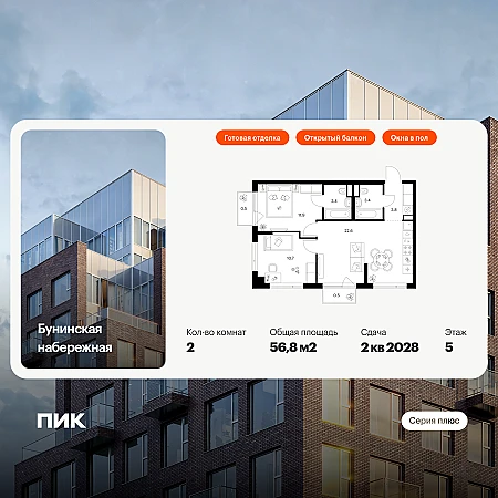 Купить 2к квартиру 56 м² в ЖК Бунинская набережная