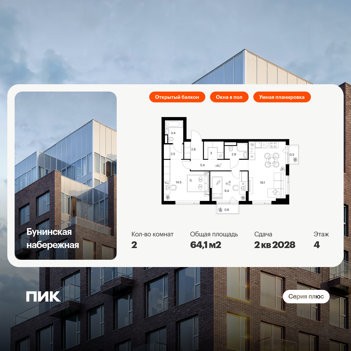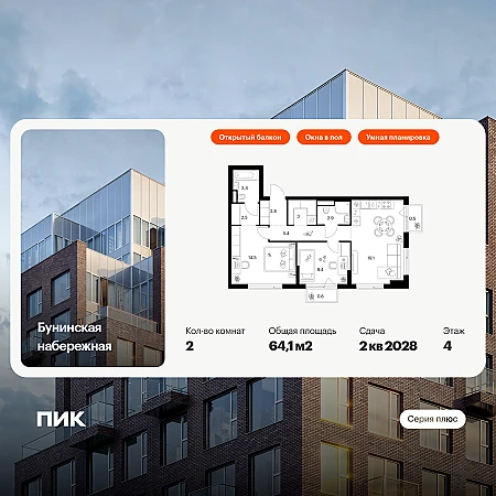 Купить 2к квартиру 64 м² в ЖК Бунинская набережная