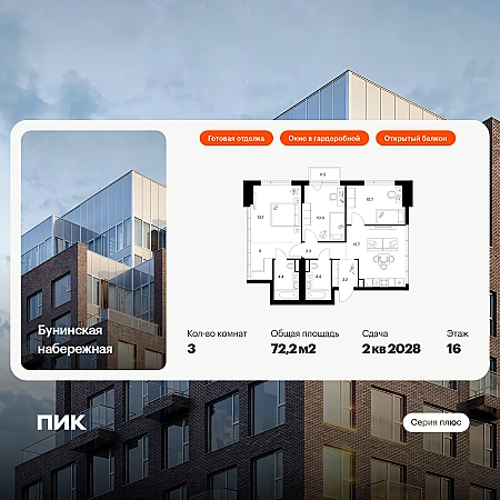 Продаётся 3-комн.квартира площадью 72.20 кв.м на 16 этаже 16 этажного дома (Корпус 2.6/1.3, секция 3) проекта ПИК Бунинская набережная. Светлый просторный подъезд на уровне земли, функциональная планировка, большие окна, с отделкой.