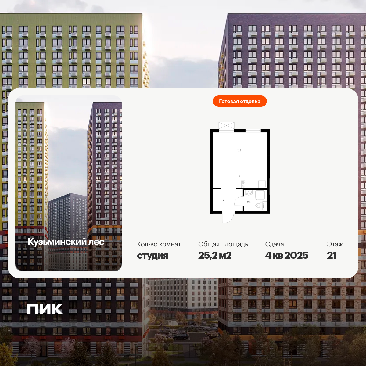 Продаётся квартира-студия площадью 28.90 кв.м на 7 этаже 28 этажного дома (Корпус 5.4, секция 5) проекта ПИК Зелёный парк. Светлый просторный подъезд на уровне земли, функциональная планировка, большие окна, с отделкой.