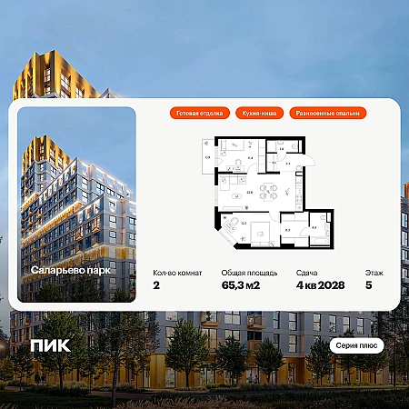 Продаётся 2-комн.квартира площадью 65.30 кв.м на 5 этаже 16 этажного дома (Корпус 82.2, секция 2) проекта ПИК Саларьево парк. Светлый просторный подъезд на уровне земли, функциональная планировка, большие окна, с отделкой.