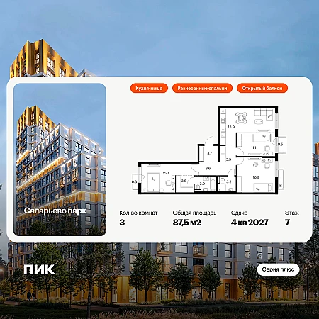 Продаётся 3-комн.квартира площадью 87.50 кв.м на 7 этаже 15 этажного дома (Корпус 57.2, секция 2) проекта ПИК Саларьево парк. Светлый просторный подъезд на уровне земли, функциональная планировка, большие окна, с отделкой.