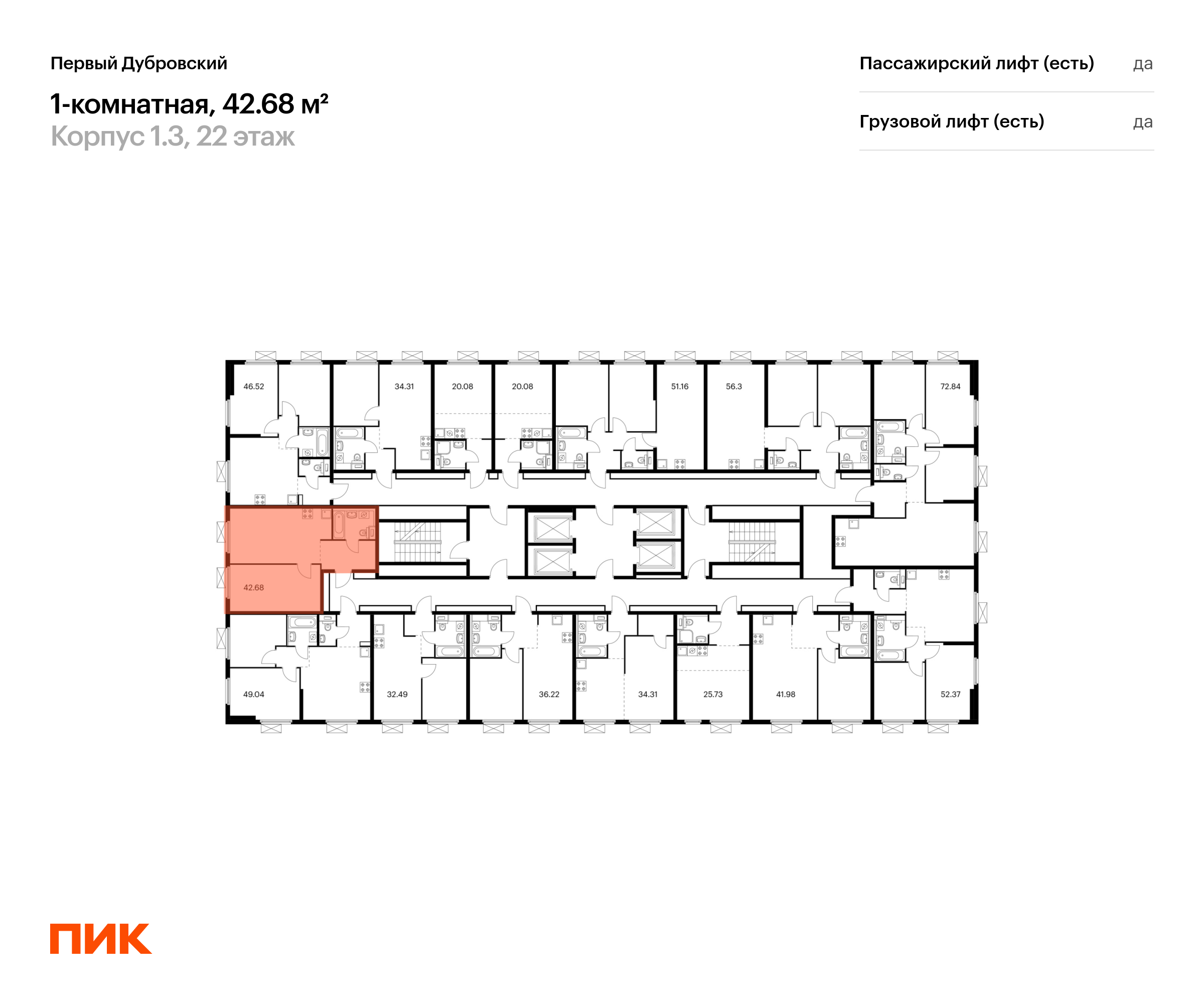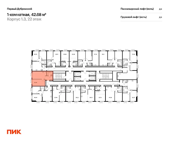 Продаётся 1-комн.квартира площадью 42.68 кв.м на 11 этаже 33 этажного дома (Корпус 1.3, секция 1) проекта ПИК Первый Дубровский. Светлый просторный подъезд на уровне земли, функциональная планировка, большие окна, с отделкой.