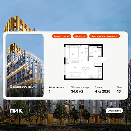 Продаётся 1-комн.квартира площадью 34.60 кв.м на 13 этаже 14 этажного дома (Корпус 82.6, секция 6) проекта ПИК Саларьево парк. Светлый просторный подъезд на уровне земли, функциональная планировка, большие окна, с отделкой.