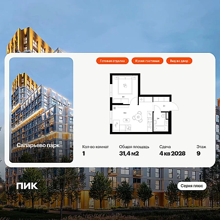 Продаётся 1-комн.квартира площадью 31.40 кв.м на 9 этаже 24 этажного дома (Корпус 82.7, секция 7) проекта ПИК Саларьево парк. Светлый просторный подъезд на уровне земли, функциональная планировка, большие окна, с отделкой.