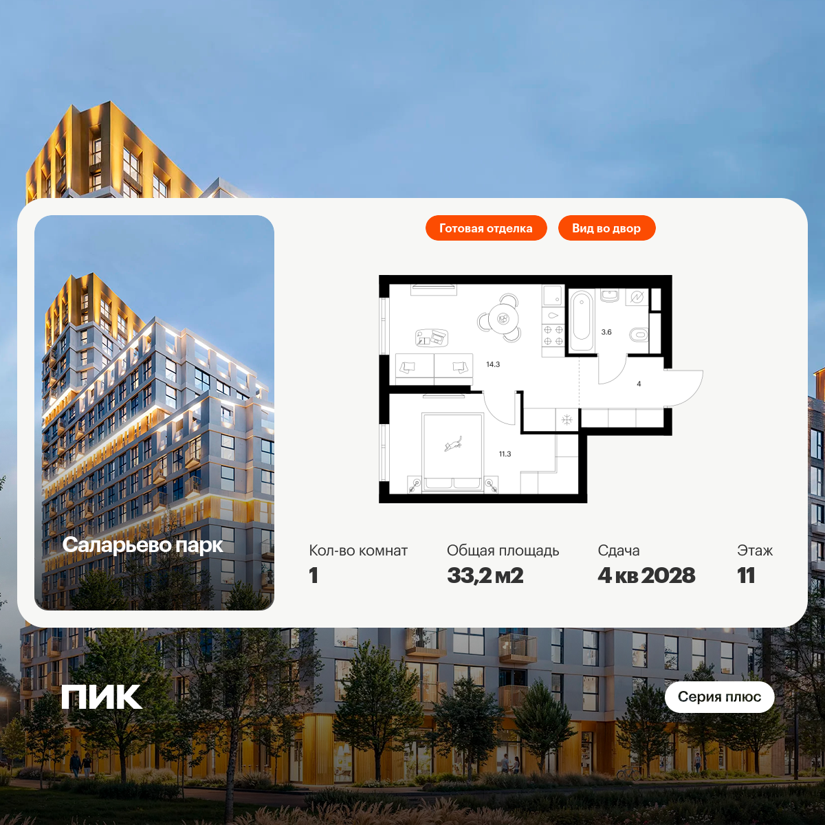 Продаётся 1-комн.квартира площадью 33.20 кв.м на 11 этаже 24 этажного дома (Корпус 82.7, секция 7) проекта ПИК Саларьево парк. Светлый просторный подъезд на уровне земли, функциональная планировка, большие окна, с отделкой.