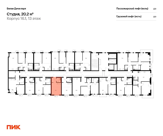Продаётся квартира-студия площадью 20.20 кв.м на 13 этаже 25 этажного дома (Корпус 16.1, секция 1) проекта ПИК Белая Дача парк. Светлый просторный подъезд на уровне земли, функциональная планировка, большие окна, с отделкой.
