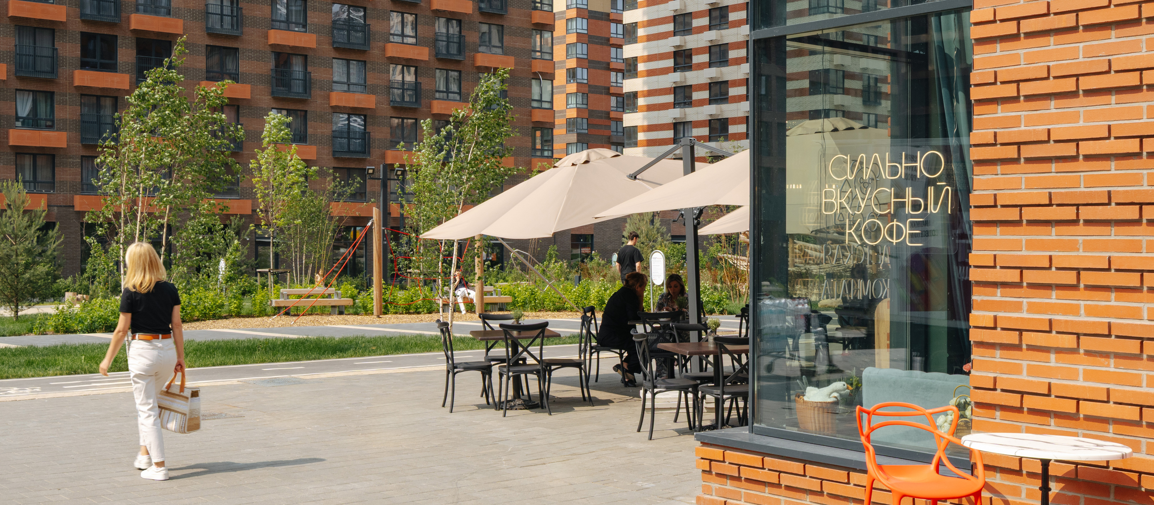 Уже открыта часть пешеходного бульвара, где можно гулять, играть с детьми, заниматься спортом и отдыхать у сухого фонтана с ночной подсветкой. Работает современное общественное пространство ОМА с супермаркетом, магазинами, рестораном и интерьерными студиями.