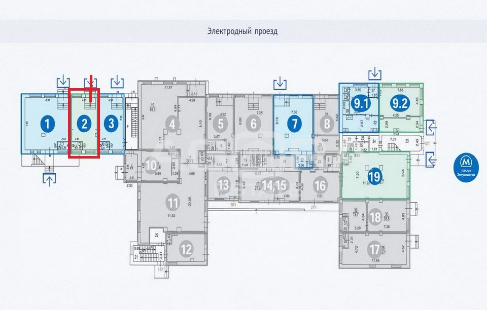 От собственника. ПСН расположено на 1-м этаже административного здания, на 1-й линии Электродного проезда и шоссе Энтузиастов, в 200 метрах от станции метро Шоссе Энтузиастов. Площадь помещения 38 м2 (блок 2 на плане). В помещении есть отдельный вход с фасада. Большие витринные окна, свободная планировка, высокие потолки – 3 м, собственный с/у, выполнен свежий ремонт в стиле лофт. Установлена приточно-вытяжная вентиляция и система центрального отопления. Выделенная мощность 8 кВт. В блоке установлены приборы учета электроэнергии и воды.