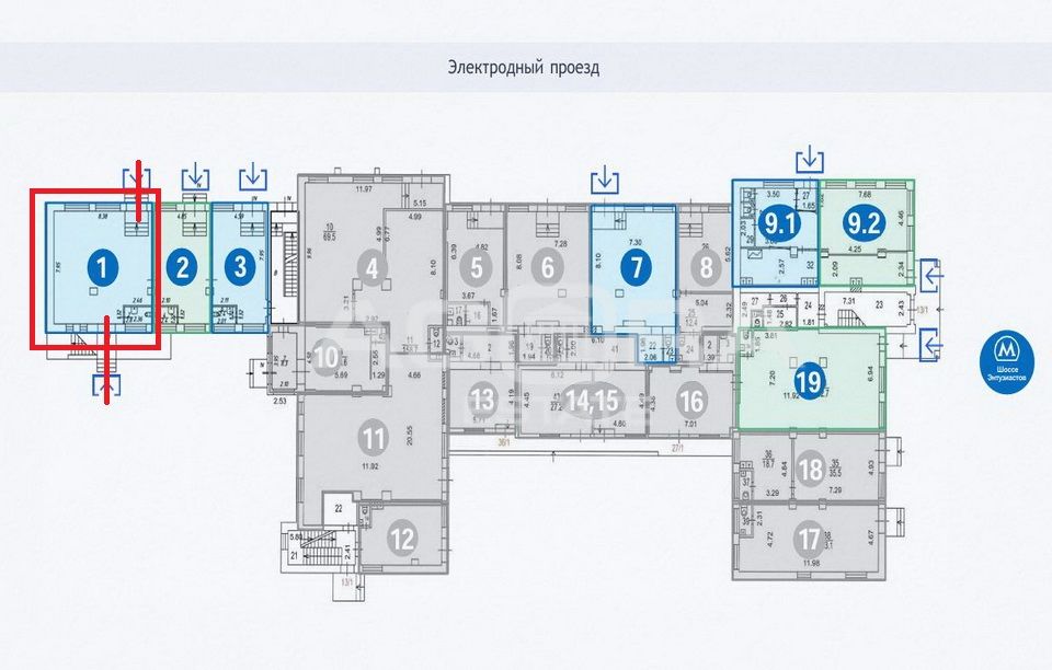 От собственника. ПСН расположено на 1-м этаже административного здания, на 1-й линии Электродного проезда и шоссе Энтузиастов, в 200 метрах от станции метро Шоссе Энтузиастов. Площадь помещения 65,7 м2 (блок 1 на плане). В помещении есть 2 отдельных входа, 1 - с фасада, 1 - со стороны двора. Большие витринные окна, свободная планировка, высокие потолки – 3 м, собственный с/у, выполнен свежий ремонт в стиле лофт. Установлена приточно-вытяжная вентиляция и система центрального отопления. Выделенная мощность 10 кВт. В блоке установлены приборы учета электроэнергии и воды.