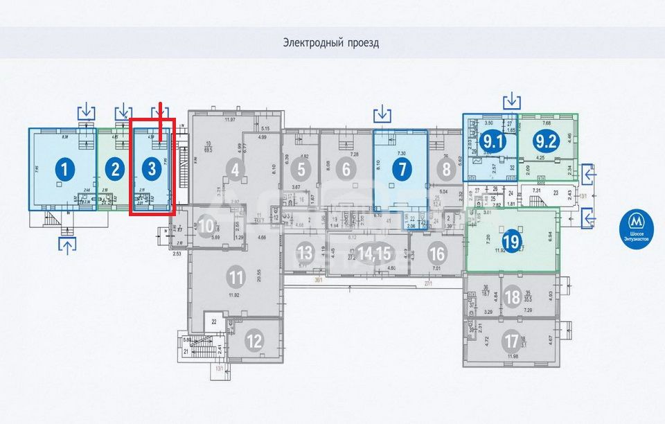 От собственника. ПСН расположено на 1-м этаже административного здания, на 1-й линии Электродного проезда и шоссе Энтузиастов, в 200 метрах от станции метро Шоссе Энтузиастов. Площадь помещения 36,4 м2 (блок 3 на плане). В помещении есть отдельный вход с фасада. Большие витринные окна, свободная планировка, высокие потолки – 3 м, собственный с/у, выполнен свежий ремонт в стиле лофт. Установлена приточно-вытяжная вентиляция и система центрального отопления. Выделенная мощность 8 кВт. В блоке установлены приборы учета электроэнергии и воды.