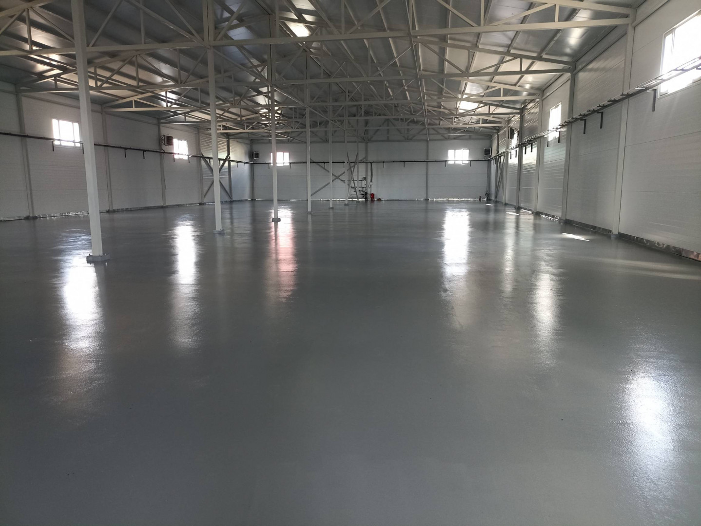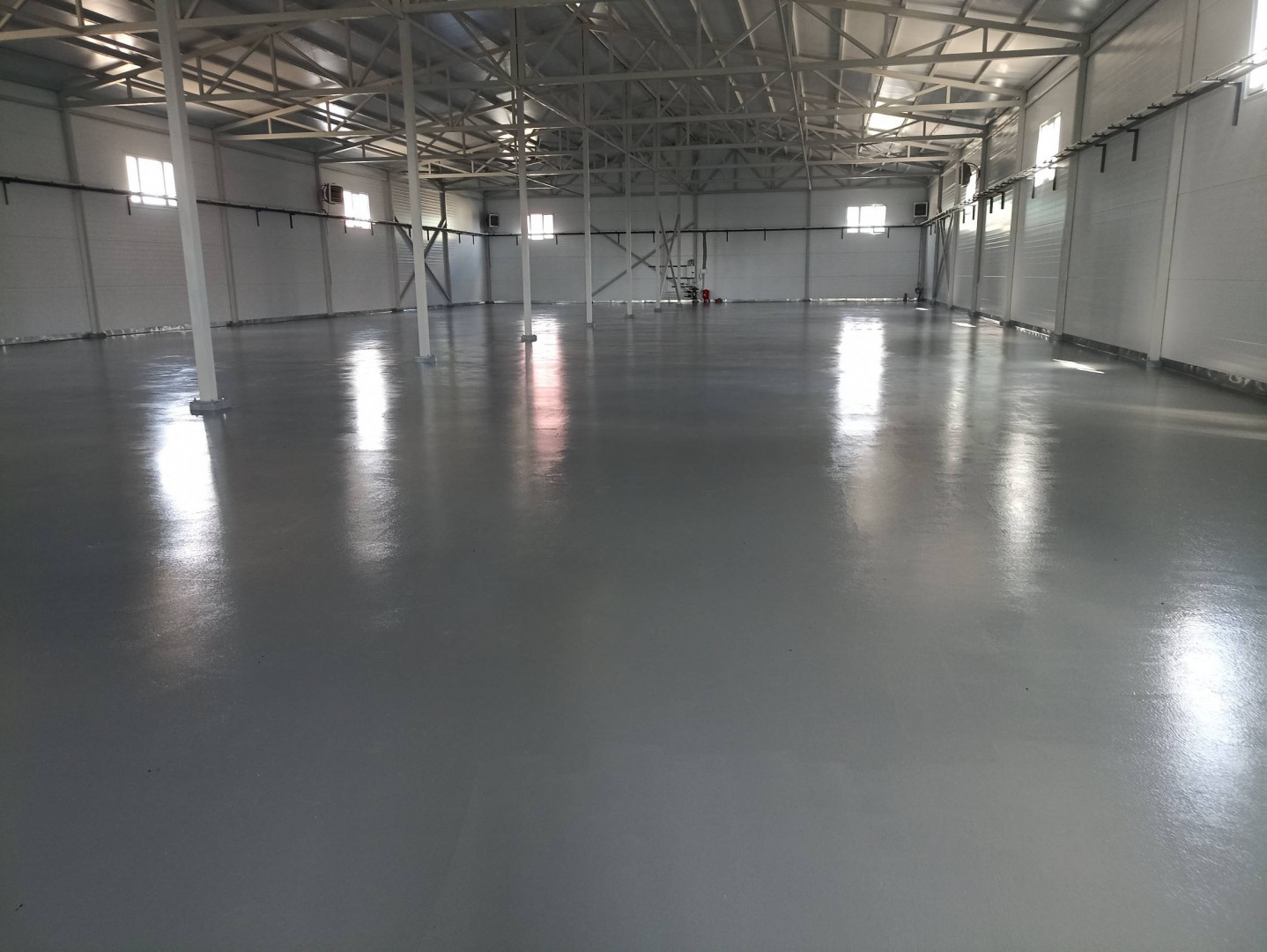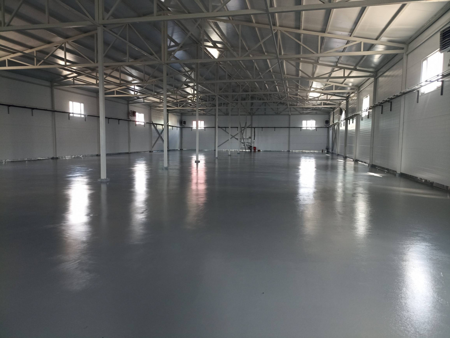 Открытая планировка, типовой ремонт, бетонный пол, высота потолков — 8 м.