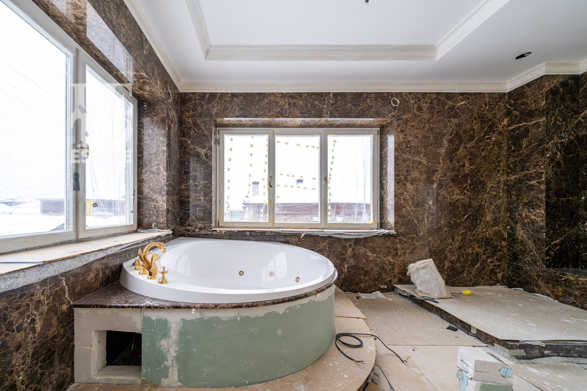 В основном доме частично выполнена финишная отделка. Установлены деревянные окна, мраморные подоконники.