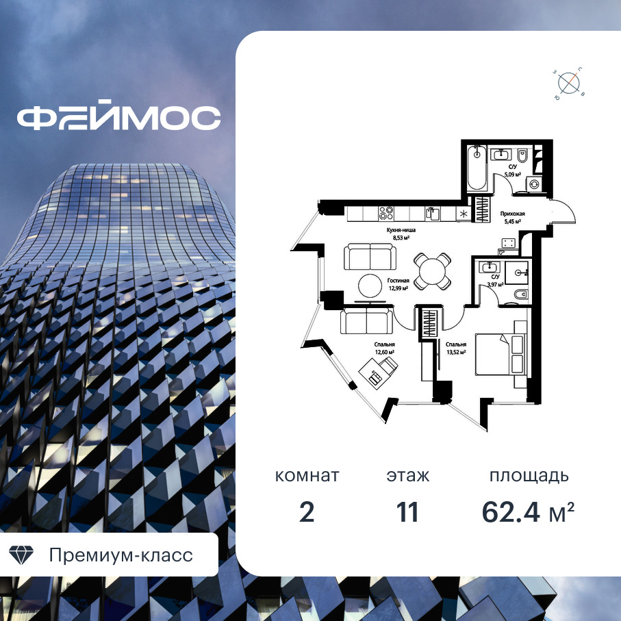 Продаётся 2-к квартира общей площадью 62.40 кв. м с предчистовой отделкой на 11-м этаже премиального небоскреба Феймос.