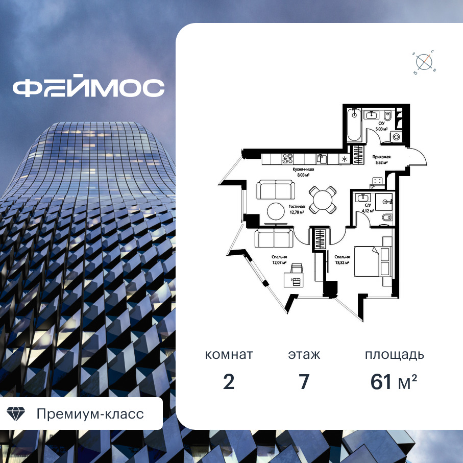 Продаётся 2-к квартира общей площадью 61 кв. м с предчистовой отделкой на 7-м этаже премиального небоскреба Феймос.