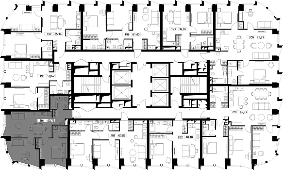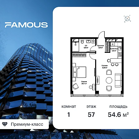 Продаётся 1-к квартира общей площадью 57.70 кв. м без отделки на 57-м этаже премиального небоскреба Famous.