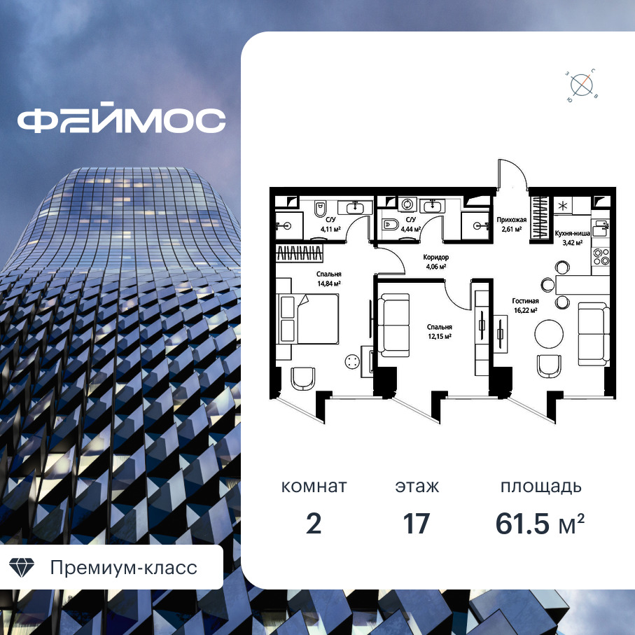 Продаётся 2-к квартира общей площадью 61.50 кв. м с предчистовой отделкой на 17-м этаже премиального небоскреба Феймос.