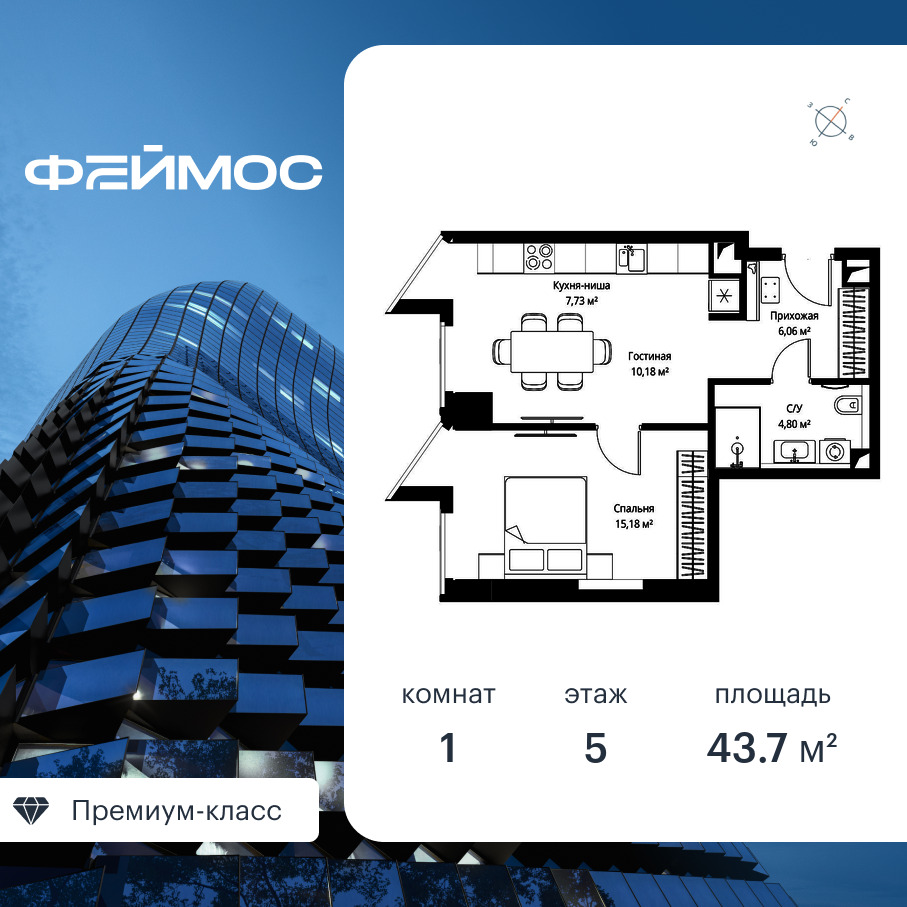 Продаётся 1-к квартира общей площадью 43.70 кв. м с предчистовой отделкой на 5-м этаже премиального небоскреба Феймос.
