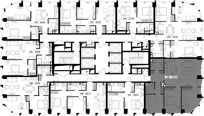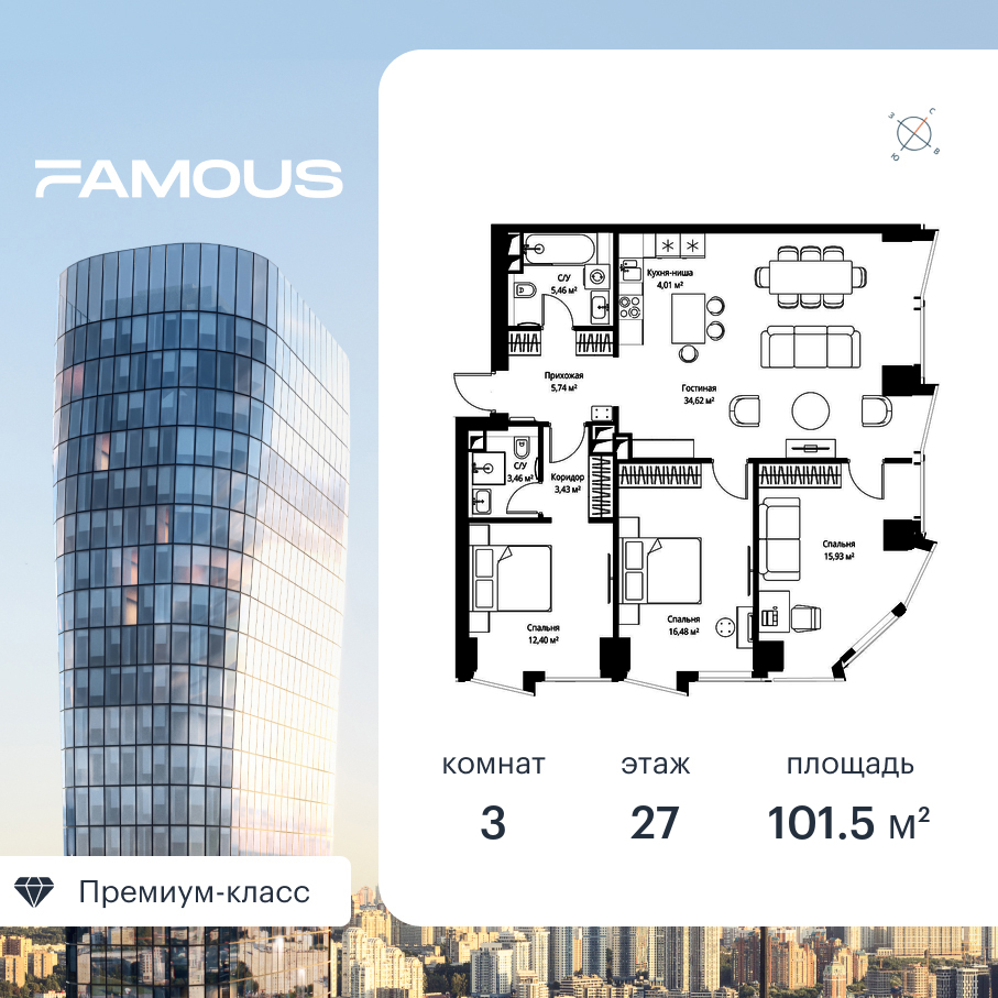 Продаётся 3-к квартира общей площадью 101.80 кв. м с предчистовой отделкой на 27-м этаже премиального небоскреба Famous.