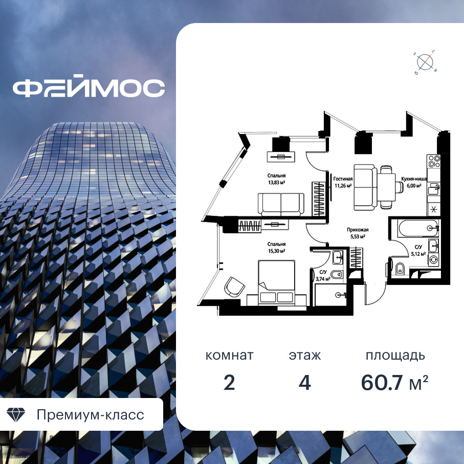 Продаётся 2-к квартира общей площадью 60.70 кв. м с предчистовой отделкой на 4-м этаже премиального небоскреба Феймос.