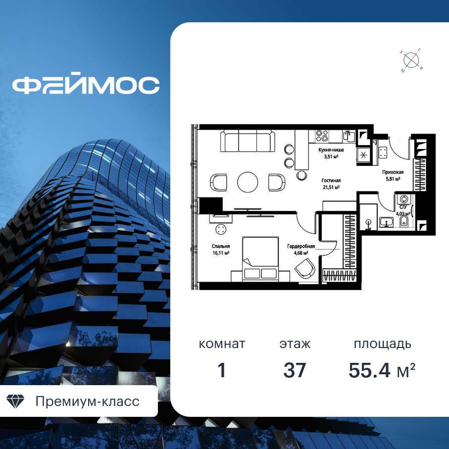 Продаётся 1-к квартира общей площадью 55.40 кв. м с предчистовой отделкой на 37-м этаже премиального небоскреба Феймос.