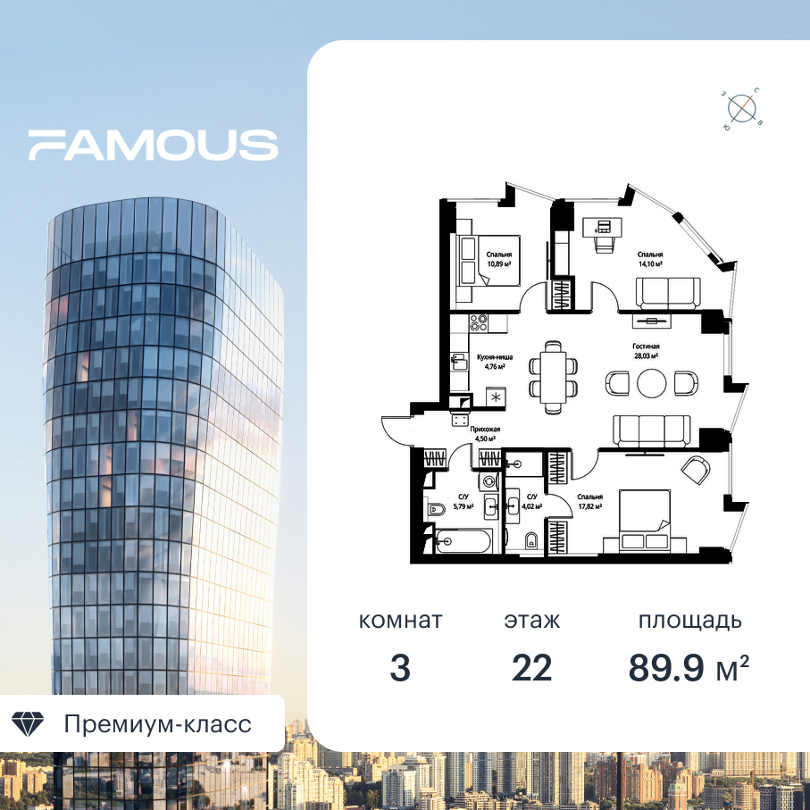 Продаётся 3-к квартира общей площадью 90.50 кв. м с предчистовой отделкой на 22-м этаже премиального небоскреба Famous.
