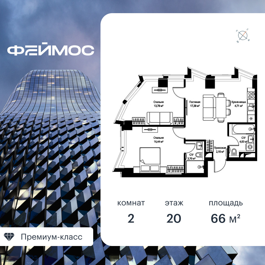 Продаётся 2-к квартира общей площадью 66 кв. м с предчистовой отделкой на 20-м этаже премиального небоскреба Феймос.