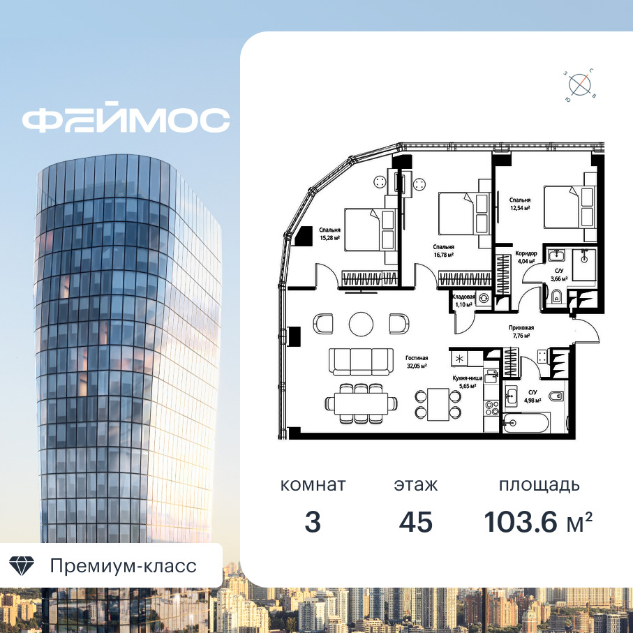 Продаётся 3-к квартира общей площадью 103.60 кв. м с предчистовой отделкой на 45-м этаже премиального небоскреба Феймос.