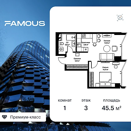Продаётся 1-к квартира общей площадью 45.60 кв. м с предчистовой отделкой на 3-м этаже премиального небоскреба Famous.