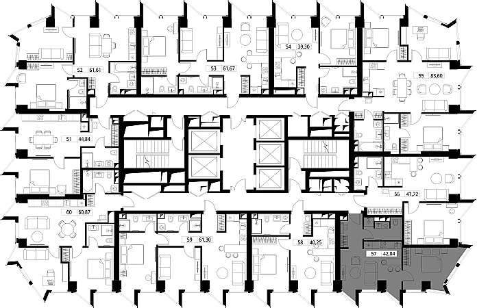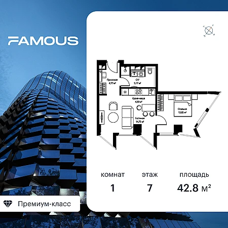 Продаётся 1-к квартира общей площадью 43.10 кв. м с предчистовой отделкой на 7-м этаже премиального небоскреба Famous.