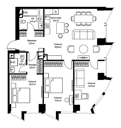 Продаётся 3-к квартира общей площадью 98.30 кв. м с предчистовой отделкой на 17-м этаже премиального небоскреба Famous.