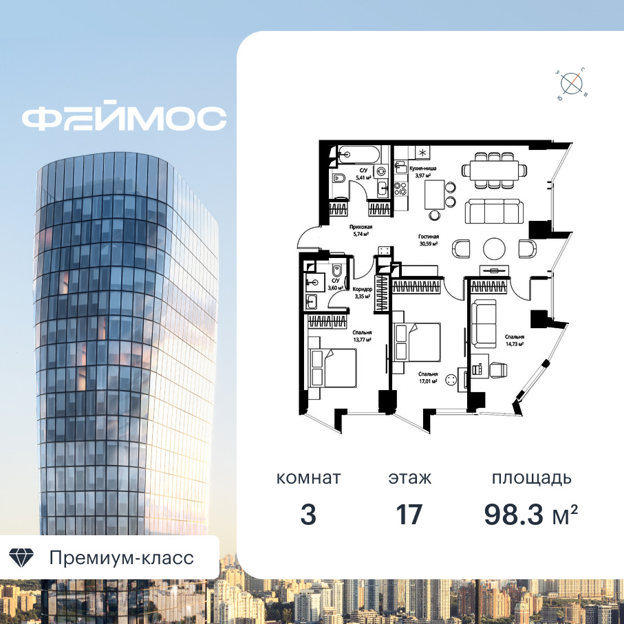 Продаётся 3-к квартира общей площадью 98.30 кв. м с предчистовой отделкой на 17-м этаже премиального небоскреба Феймос.