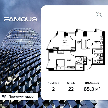 Продаётся 2-к квартира общей площадью 65.70 кв. м с предчистовой отделкой на 22-м этаже премиального небоскреба Famous.