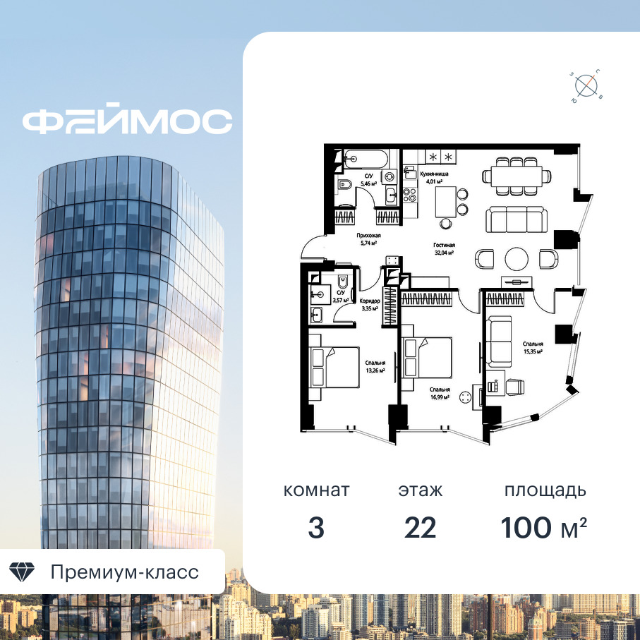 Продаётся 3-к квартира общей площадью 100 кв. м с предчистовой отделкой на 22-м этаже премиального небоскреба Феймос.