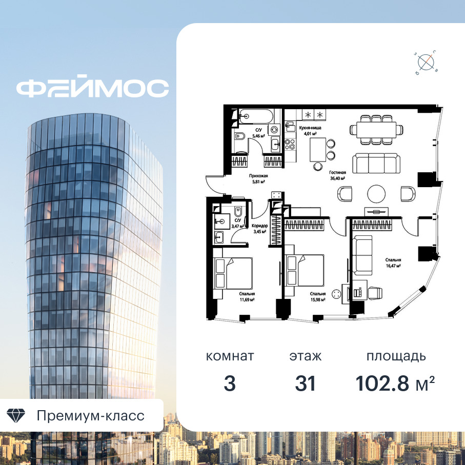 Продаётся 3-к квартира общей площадью 102.80 кв. м с предчистовой отделкой на 31-м этаже премиального небоскреба Феймос.