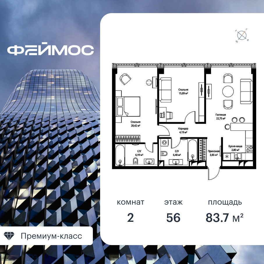Продаётся 2-к квартира общей площадью 83.70 кв. м с предчистовой отделкой на 56-м этаже премиального небоскреба Феймос.