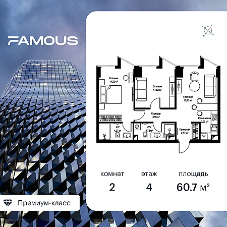 Продаётся 2-к квартира общей площадью 60.20 кв. м с предчистовой отделкой на 4-м этаже премиального небоскреба Famous.