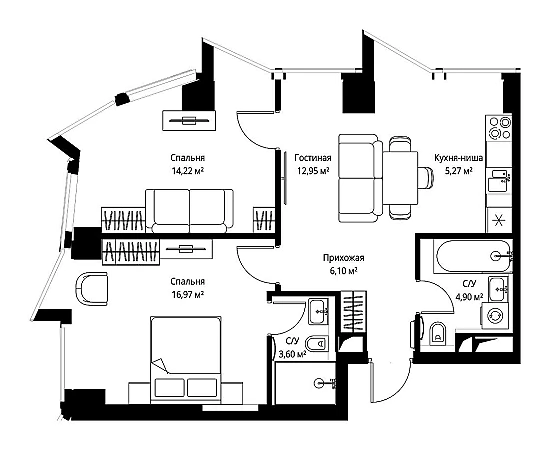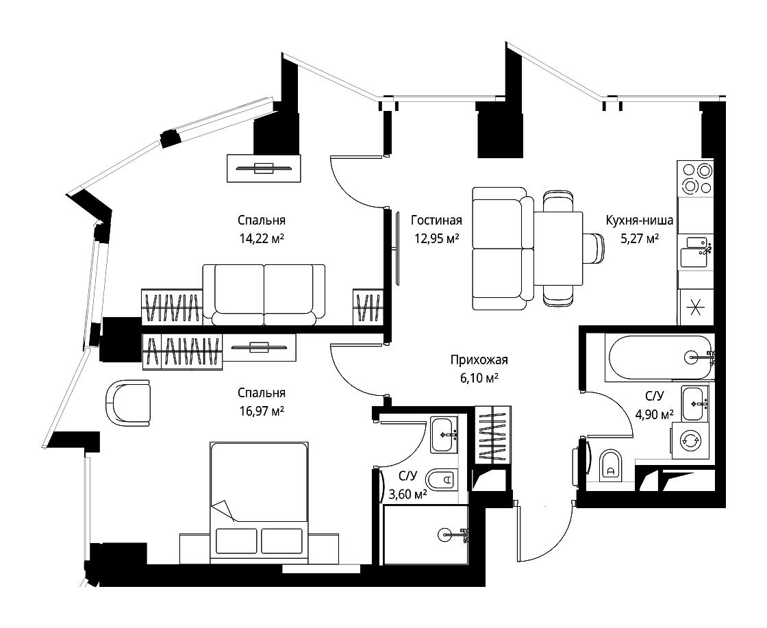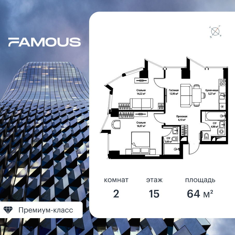 Продаётся 2-к квартира общей площадью 63.70 кв. м с предчистовой отделкой на 15-м этаже премиального небоскреба Famous.