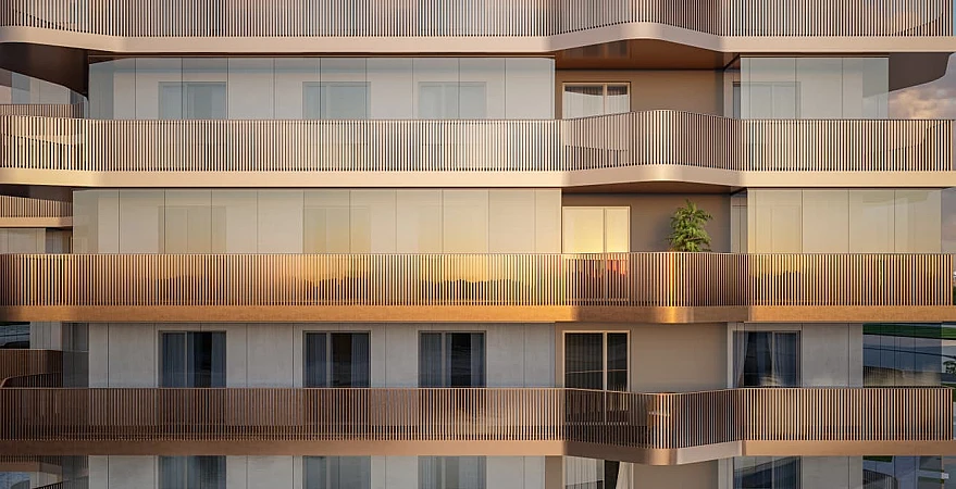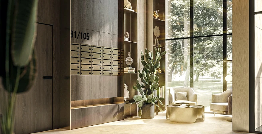 Изображения трех акцентных башен, напоминающих речные волны, кильватер судна и морские брызги. В дизайне фасадов типовых зданий используются горизонтальные скобы, создающие иллюзию «колеблющихся» стен, которые словно откликаются на прикосновение каждого порыва ветра.Двор на стилобате разделен на различные функциональные зоны: для детей предусмотрены игровые площадки, активным жителям предложены спортивные секции, а также обустроены уютные уголки для отдыха и прогулок, газоны и живописные аллеи. На протяженной набережной разместятся городская площадь, летние веранды и уютные павильоны.Просторные лобби с высотой потолков в 5 метров, консьерж-сервис и комфортабельная мебель на встрече гостей. Внутренние помещения включают колясочные, санитарные узлы и комнаты для стирки лап домашних любимцев. Подъезды оборудованы домофонами Fermax с функцией распознавания лиц.