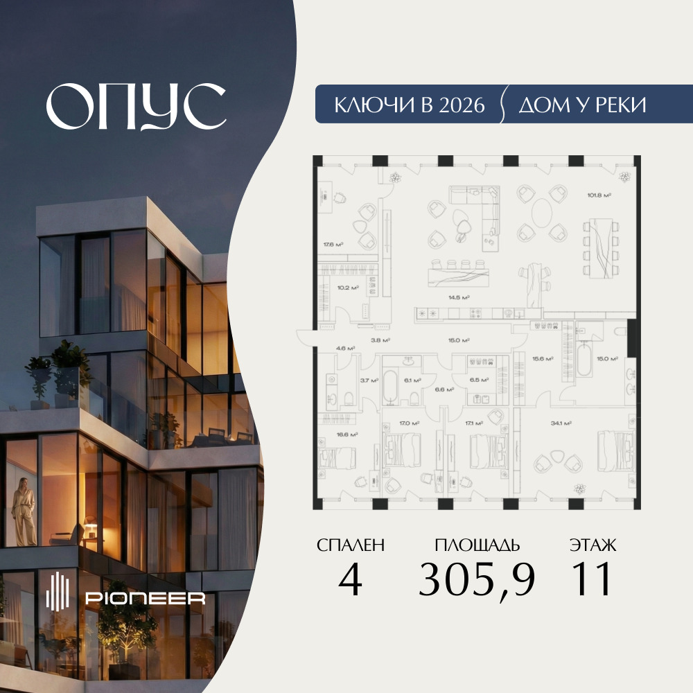 Прямая продажа от застройщика! Продаётся 4-к квартира общей площадью 305.9 кв. м. на 11-м этаже 11 этажного дома. Клубный дом ОПУС - современный шедевр архитектуры от компании PIONEER, трансформирующий пространство, меняющий привычный ход вещей. Близость Москвы-реки определила его исключительную форму, вдохновлённую стихией воды. Уникальный и единственный в своём роде ОПУС создаёт ощущение преображения, деликатно взаимодействуя с городской тканью. Продуманная территория с парковой атмосферой позволяет находиться в уединении в самом центре города, именно эти исключительные характеристики делают ОПУС особенным. Площадь однокомнатной квартиры здесь превышает 50 квадратных метров, а отдельные трёхкомнатные решения восхищают 266-метровым простором и видами на реку. Уникальные квартиры с 8 балконами на разные стороны света, не менее эффектные решения - кабинеты и гардеробные с отдельными балконами, а ванные комнаты с панорамными окнами и собственным балконом. ОПУС располагается в историческом месте с видом на Крутицкое подворье и Симоновский вал. Совсем рядом легендарное Замоскворечье - район, сохранивший камерную атмосферу старой Москвы. Локация уникальна также тем, что новые современные объекты будут соседствовать здесь с культовыми объектами культурного и исторического наследия города. За 22 года на рынке недвижимости компания PIONEER реализовала более 30 проектов. Сегодня PIONEER - девелопер премиальной недвижимости с 4 проектами класса премиум и deluxe. Продажа от застройщика. Покупка доступна в рассрочку и ипотеку. Звоните, и мы с удовольствием расскажем все подробности о проекте и условиях покупки.