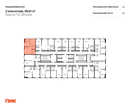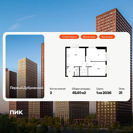 Продаётся 2-комн.квартира площадью 45.61 кв.м на 21 этаже 38 этажного дома (Корпус 1.4, секция 2) проекта ПИК Первый Дубровский. Светлый просторный подъезд на уровне земли, функциональная планировка, большие окна, с отделкой.