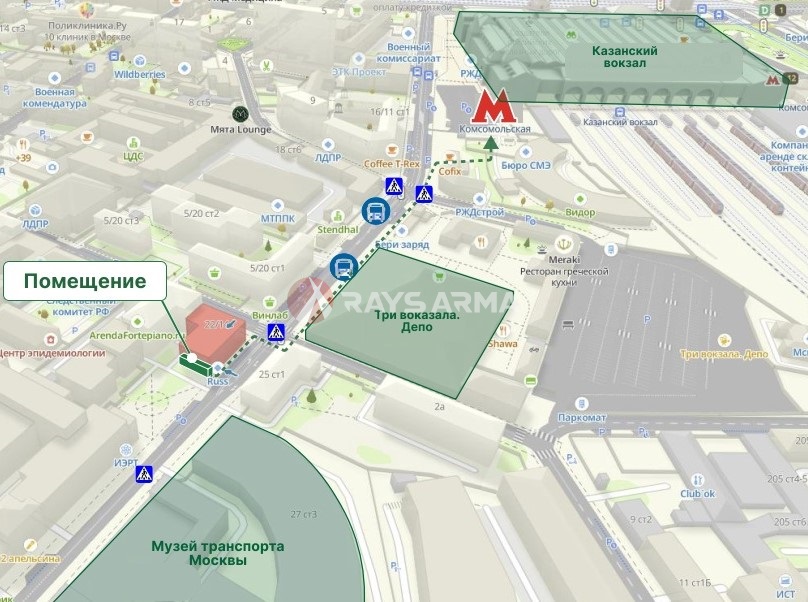 готовой еды МИЛТИ (МАП 250 т. рублей, КДА с 26.02.2026 года на 11 месяцев, индексация 7%), расположенном на 1 этаже 4-х этажного дома. 2 входа, эл. мощность 15 кВт. 300 м от метро Комсомольская! Рядом “Три вокзала. Депо”, Институт и музей транспорта Москвы. Интенсивный пешеходный трафик. Первая линия Новорязанской улицы. Более 11 000 жителей в радиусе 500 м. Возможность размещения рекламы.